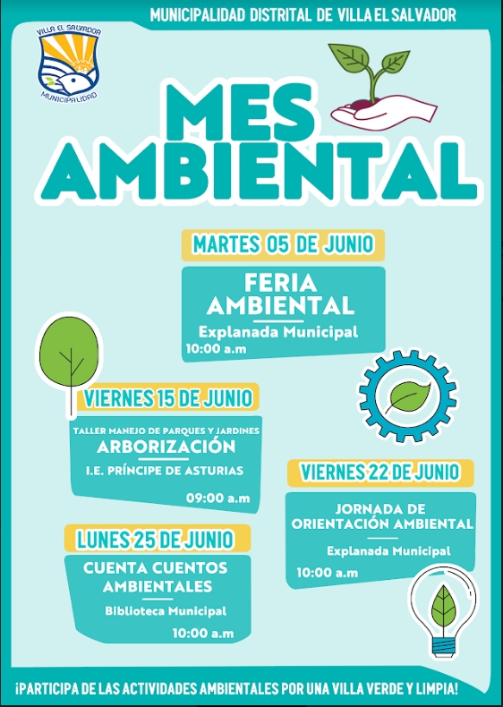 Vecino, vecina te invitamos a participar de las actividades a realizarse en el MES AMBIENTAL. Las actividades están dirigidas a la población en general y se desarrollarán en diversas zonas del distrito buscando fortalecer la concientización ambiental para una VILLA LIMPIA Y VERDE.