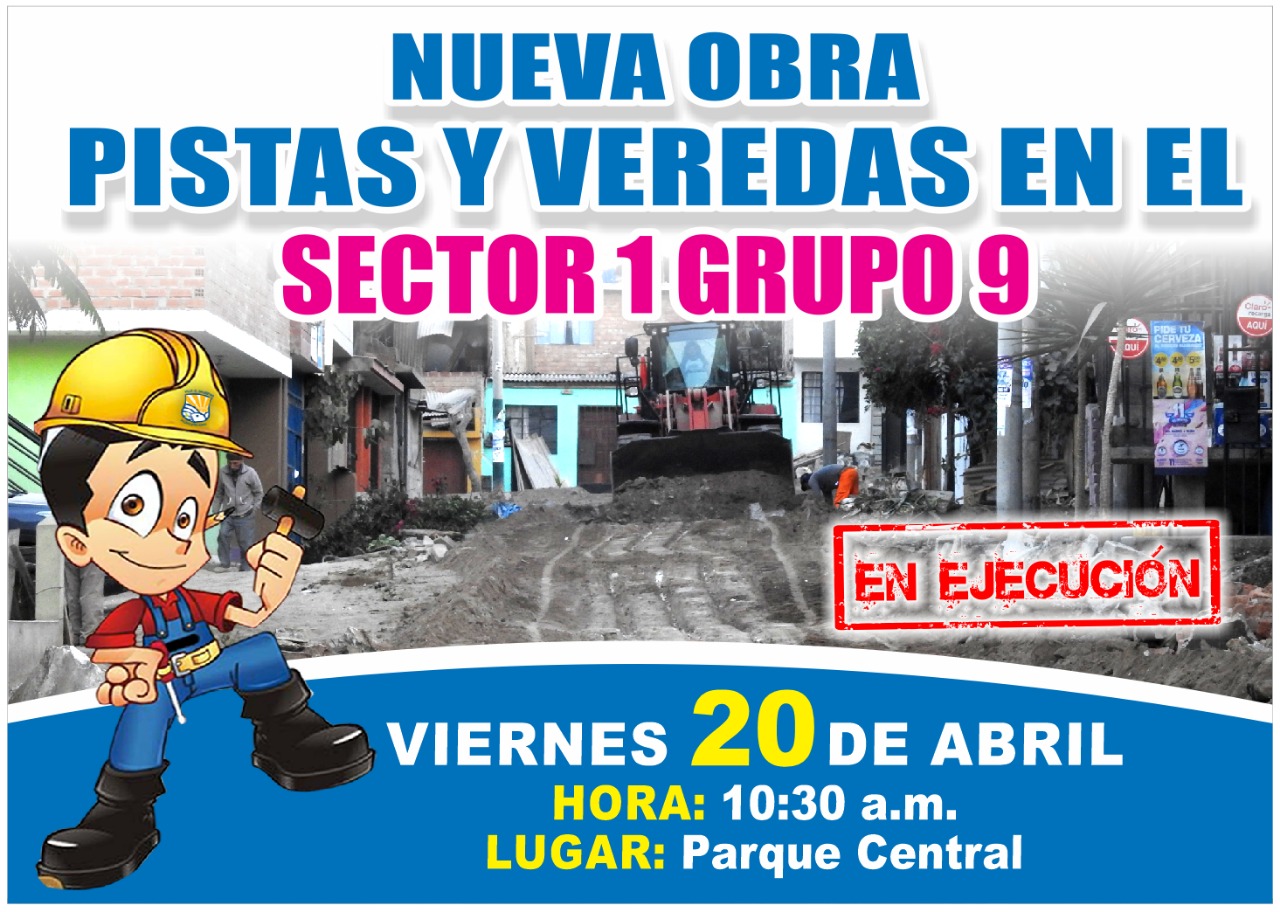 Invitamos a todos los vecinos a acompañar a nuestro alcalde Guido Iñigo en su visita al Grupo 09 del Primer Sector, donde a partir de las 10:30 a.m. estará supervisando los trabajos de pistas y veredas en esta zona.