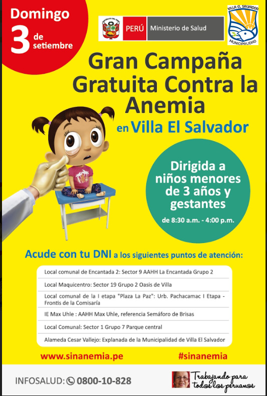 La municipalidad distrital y el Ministerio de Salud invitan a los vecinos a participar de la campaña nacional de control de anemia en niños menores de tres años de edad y gestantes, a realizarse este domingo 03 de setiembre de 8:30 a.m. a 4:00 p.m. en los lugares donde se detalla en el flyer.