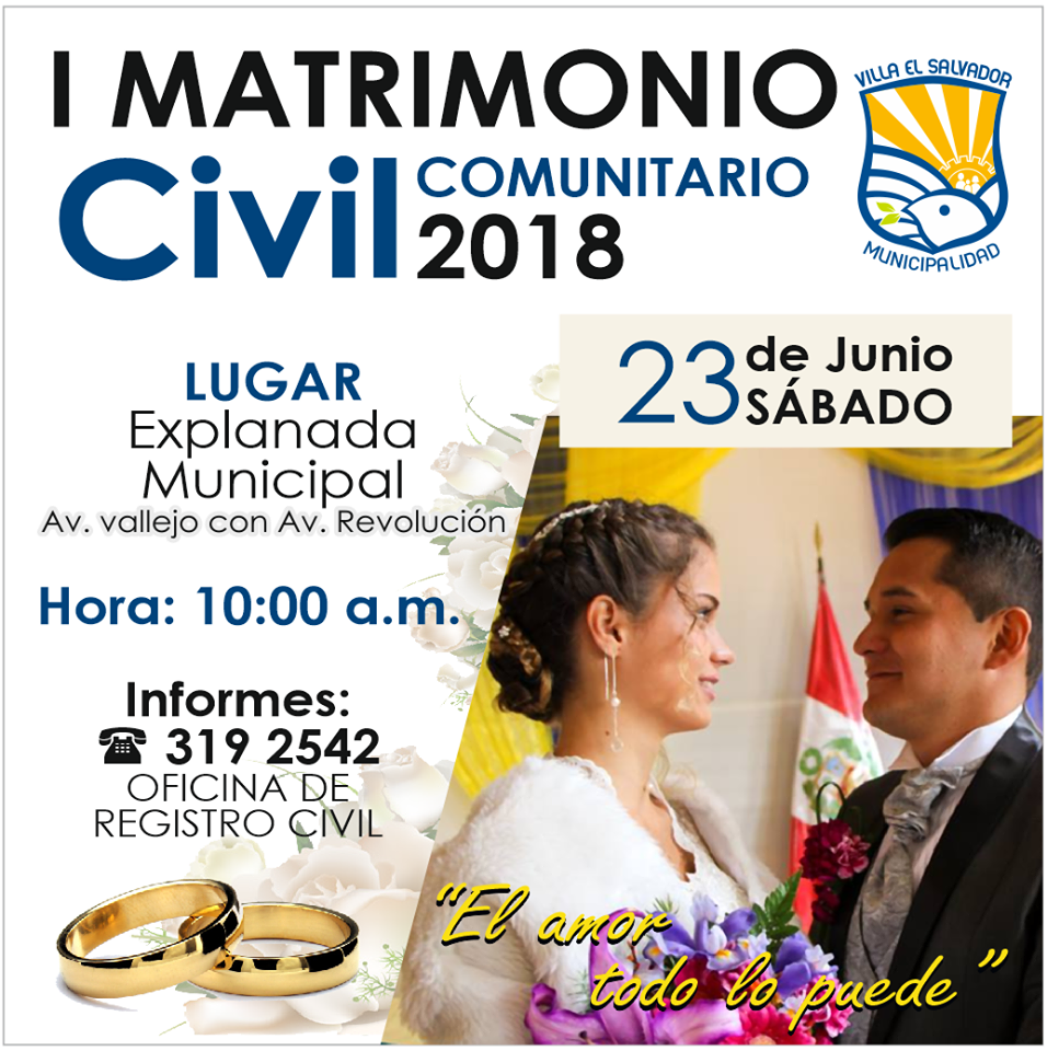 Atención vecinos y vecinas, si desean unirse al amor de su vida, esta es la oportunidad de formalizar su relación en el I Matrimonio Civil Comunitario 2018 a realizarse el sábado 23 de junio en nuestra explanada municipal a las 10:00 a.m.