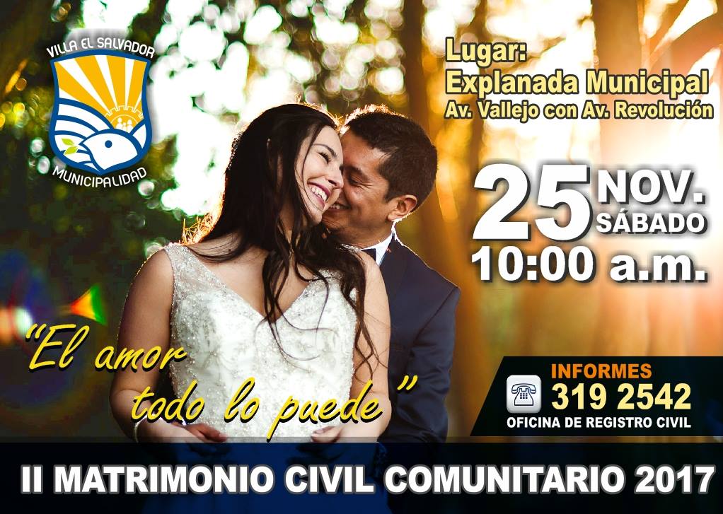 Con la finalidad de promover la unión familiar en la sociedad y formalizar el estado conyugal de las parejas que llevan años de convivencia, la municipalidad distrital realizará el 25 de noviembre el segundo matrimonio civil comunitario, en el cual se espera contar con la participación de más de 150 parejas.